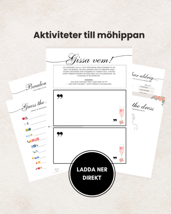 Planerar du en möhippa och vill ha roliga aktiviteter utan stress? Det här paketet innehåller flera färdiga lekar som garanterat skapar skratt, minnen och härlig stämning under firandet. Perfekt för både små och stora sällskap — skriv bara ut och kör igång. I paketet ingår bland annat lekar som Gissa vem, Guess the dress, Jag har aldrig…, Charader, Brudens val och Guess the song. Alla spel är designade i en stilren och festlig layout som passar perfekt till möhippa.